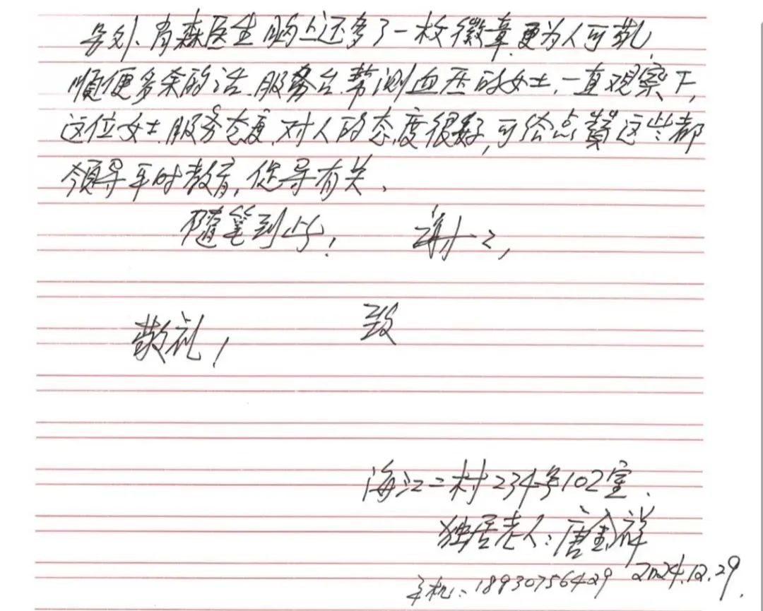 老人在信中提到,肖森博士对病人的态度和蔼真诚,总是耐心地回答病人的问题,能够站在病人的角度思考,会根据每个病人的情况给出最适合病人的用药建议。他认为肖森博士真的做到了“急病人,想病人的想法”,是一个有医德有医术的好医生!