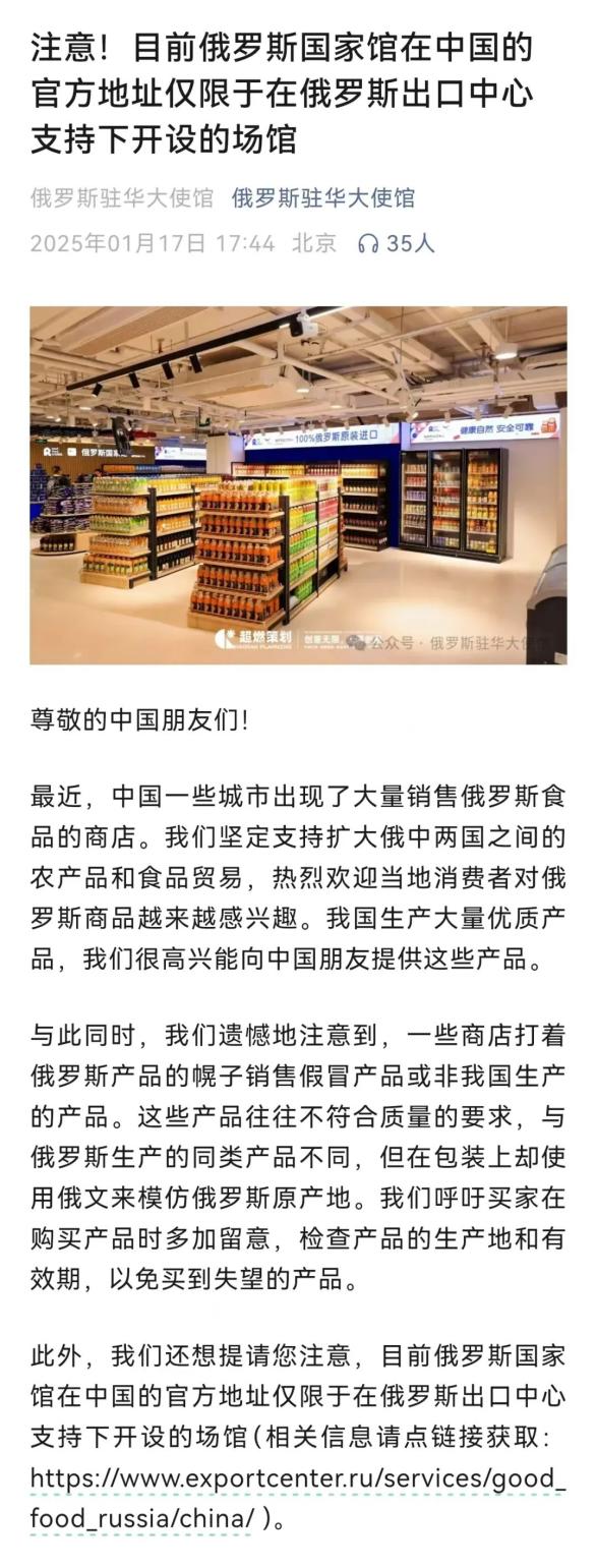 与此同时,俄罗斯驻华大使馆注意到,一些商店打着俄罗斯产品的幌子出售假冒产品或非俄罗斯产品。这类产品通常不符合质量要求,不同于俄罗斯制造的同类产品,但俄罗斯用于包装模仿俄罗斯原产地。俄罗斯驻华大使馆呼吁买家在购买产品时多加注意,检查产品的生产地点和有效期,防止购买失望的产品。