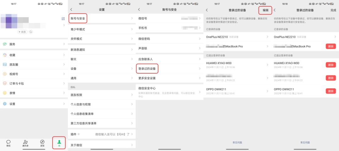 为了避免信息泄露,一方面需要删除APP登录设备记录。以微信为例,依次点击【我】-【设置】-【账号与安全】-【登录设备】-【编辑】删除旧手机登录记录。
