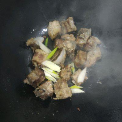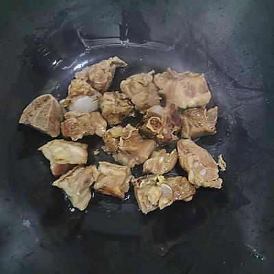 4、锅烧油热,加入处理好的排骨翻炒至发黄。