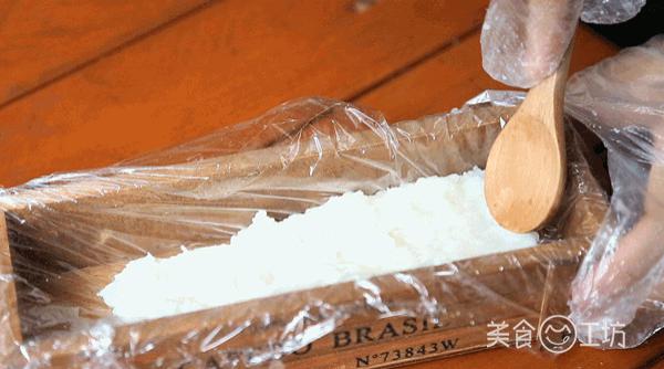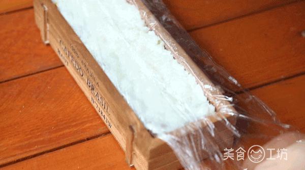 6. 最终将保鲜膜包好放入冰箱冷藏半小时定型,取出切块。