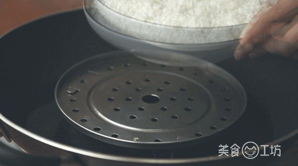 1. 用清水浸泡一夜,将浸泡好的大米放入盘中,放入锅中蒸熟。