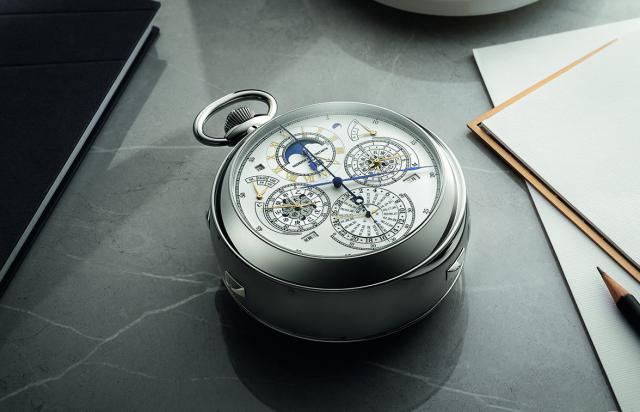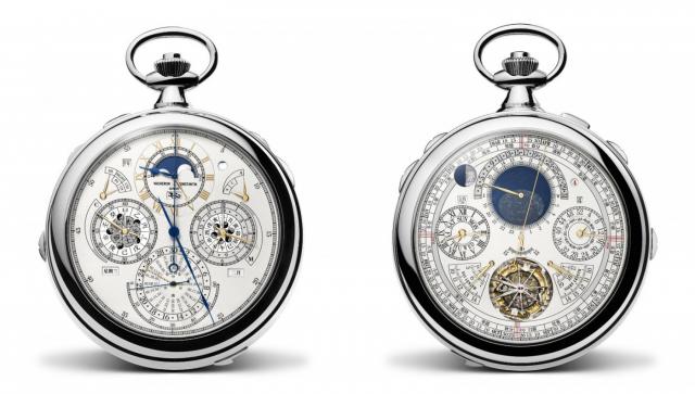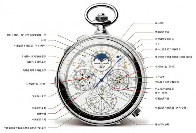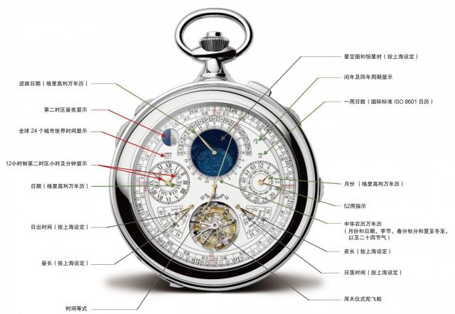 钟表的功能包括但不限于格里高利万年历,ISO 8601 日历周数显示、中华万年历、中国阴历月份日数和名称、中国阴历日期显示、中国阴历属相、五运与十天干、六气与十二地支等。,甚至可以显示到最后。 2039 中国每年春节的具体日期。另外,还具有天文功能、三问报时、自鸣装置、日出日落等功能,一应俱全绝对超乎你的想象。整个怀表的表壳都是由 18K 白金制成,内部复杂奢华,同时外界也极其华丽。这个怀表经过 11 年才开发加工而成,机芯组装需要时间。 12 个月。