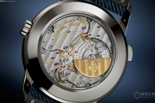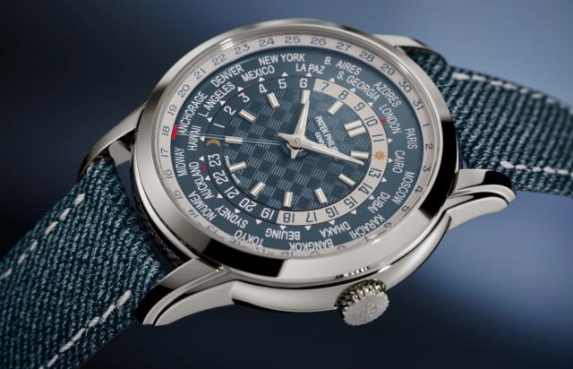 铂金表壳18K,40K 在百达翡丽中,毫米的表径、经典尺寸和奢华材料并不奇怪。在直观感受上,灰蓝色表盘中央装饰着“碳纤维”图案,再加上装饰有牛仔图案的灰蓝色小牛皮表带,充满了青春和活力。整个表盘有序划分为24,就像飞镖记分盘一样。 区域城市名称环绕表盘边缘。而 24 第二时区的阿拉伯数时标指示在一个时区内,然后向内一圈指示当地时间的棒状时标。24 在个时区之外,最外面还有一个日期圈,用锤状透明的中央指针在尖端涂上红漆,这是世界上第一个结合日期展示世界的日期。