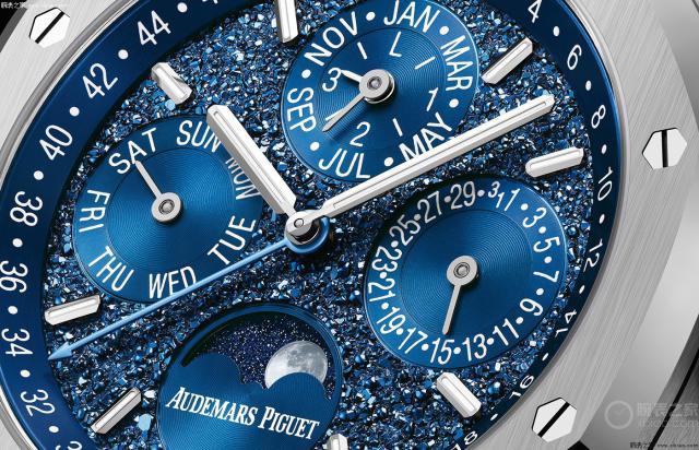 铂金表壳18K,表径为 41 mm,深蓝色“晶莹夜空”组合(Crystal Sky)“表盘,整体观感只能用“如梦如幻”四个字来形容。整个砂金石表盘,类似于晶体的不规则雕刻图案,需要工匠选择电铸金属沉积工艺,逐步用原子精度制作压印图案,然后用物理气相沉积。(PVD)该工艺促使表盘呈现深蓝色调,整体像夜空一样极其真实,18K 白金时标和指针更加显眼。上周表盘显示、月、闰年显示、日期显示、月相显示均位于表盘上 9、12、3、6 时的位置。八角表圈上的八颗露出螺钉等代表性设计依然延续。