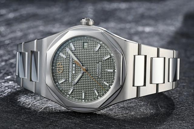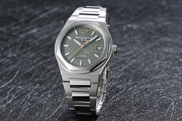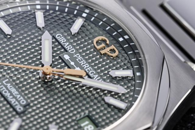 显然,这个全新的 38 以前推出的毫米芳草绿荣誉,来自于此。 42 mm全金荣誉,由冲压工艺制成的巴黎钉纹图案,使表盘质感极佳,夜光处理的杆状箭头形镀钒时标与时针和分针和谐统一。特别是 GP 的 Logo 而且中央秒针经过镀玫瑰金处理后,不但瞬间提亮了整个表面的肤色,而且给这个钢表带来了一丝贵气。此外,日历窗背景与表盘同色,路轨刻度环倾斜分钟,更顺势地增强了表盘的整体性。