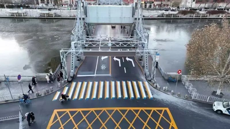 第一,解放桥河东区侧桥口完善了导向车道线、3D立体斑马线,并在停止线前增加了“停”字。车辆驾驶员需要注意的是,由于解放桥和平区侧的张自忠路是机动车的单行道,所以从世纪钟方向驶入桥面的两条车道都是机动车的左转车道;沿着解放桥从和平区向世纪钟行驶的车辆,应在桥口附近减速行驶。当行人通过人行横道时,他们应该停下来让路。他们还需要观察世纪钟前环岛路沿线的交通流量,并在确保安全的前提下前进。