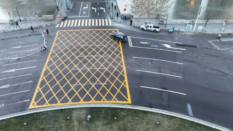 第二,解放桥和世纪钟之间新增了一条黄色网状线。当汽车在黄色网状线前行驶时,后车必须在黄色网状线外等待,以保持距离。黄色网状线只有在确定黄色网状线前有足够的空间容纳自己的车辆时才能到达。