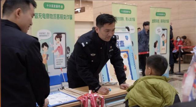在现场,一个充满活力的反诈骗宣传区在大厅中央特别引人注目。宣传展板排列有序,上面展示了常见的诈骗案例和预防要点。直观的地图文字吸引了许多市民驻足观看。最引人注目的是精心设置的反诈骗知识小游戏区。