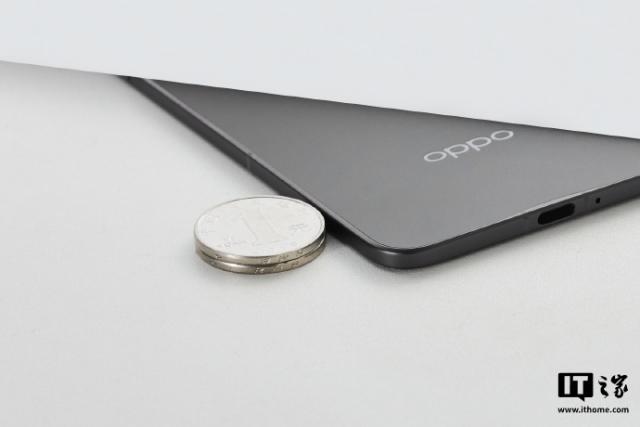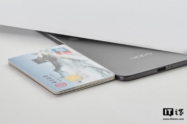 与苹果 iPhone 16 Pro Max 相比,OPPO Find N5 单侧厚度明显较薄,USB-C 接口也比较小,以满足轻薄的需求。另外,这台机器的厚度相当于四张储蓄卡或两张储蓄卡。 1 元硬币。