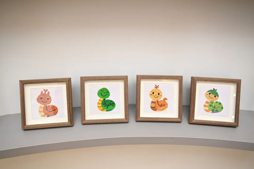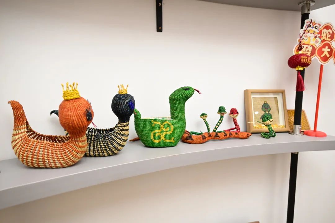 有趣可爱的卡通蛇,真实生动的鱿鱼,精致的蛇形祝福,五颜六色的蛇形贴纸...20多件作品都摆满了展示柜。徐行草的非遗传传承人王勤和她的团队花了一个多月的时间完成了这些作品。