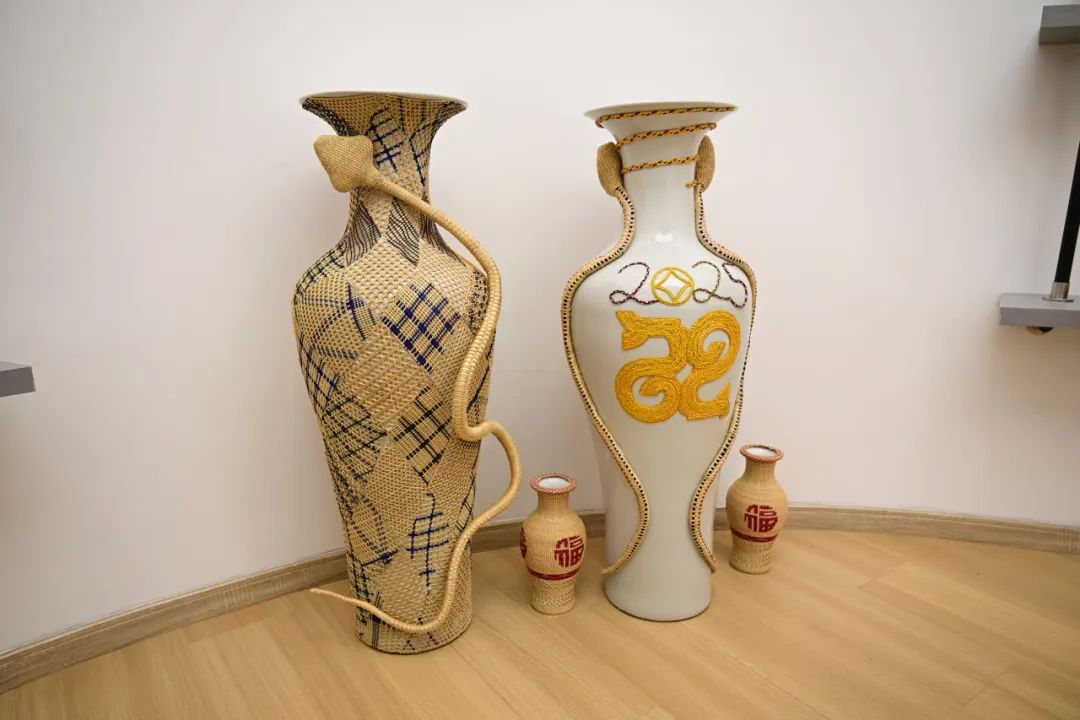 作品中最重要的是蛇“抱”和“瓶”系列。它由两个花瓶组成,一个瓶子上覆盖着不同草编图案的棱形片,全身伴有一条缠绕的草蛇,弯曲灵动地盘着瓶子往上走;另一个花瓶盘绕着两条草蛇,瓶子上有黄草编织的“2025”和“如意”图案,象征着新的一年的美好和好运。