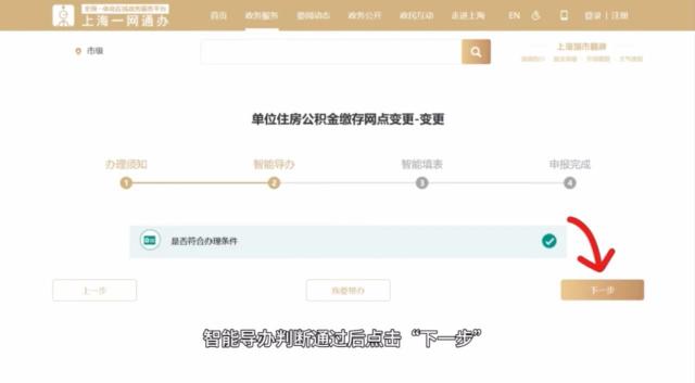 步骤四:智能导办判断通过后点击“下一步”,确定反显信息,选择“变更后辖区”和“变更后缴存网点”,点击“提交”。
