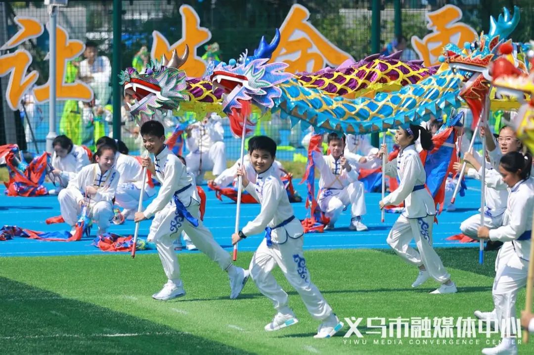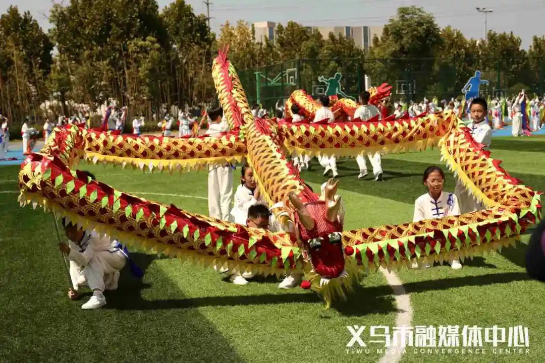 据悉,每天大课间,新丝绸之路学校都有1000多名学生,以铃声为令,以龙把为媒介,以音乐为引导,与朋友相伴,或与龙奔流,或与狮子共舞。。。这个大课间30分钟的舞龙,是强身健体的开始,是广场艺术的创造,是体育精神的聚集,是文化传承的开启。此外,在每年年初的开幕式上,学校利用义乌元宵节迎龙灯的习俗,创造了“舞蹈精神” 舞蹈爱情”迎龙灯开学典礼。