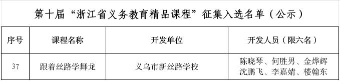 近日,浙江省教育厅教研室公布了第十届“浙江省义务教育优秀课程”入选名单,义乌市新丝路学校选定的优秀课程“跟随丝绸之路学习舞龙”名单。