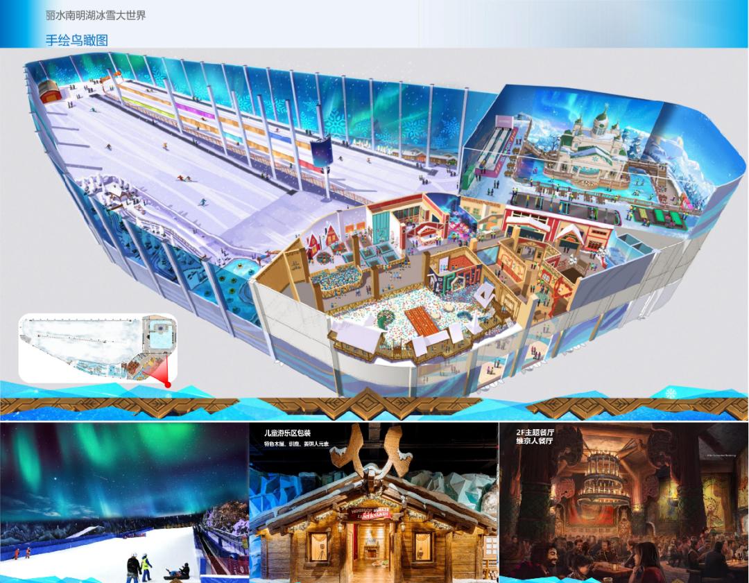 以北欧神话为设计原型的冰雪馆,场馆布局分为极地雪原(滑雪区、娱乐区)、维京主题餐厅,圣诞风商业街区,奥丁城堡真冰场,亲子公园等。