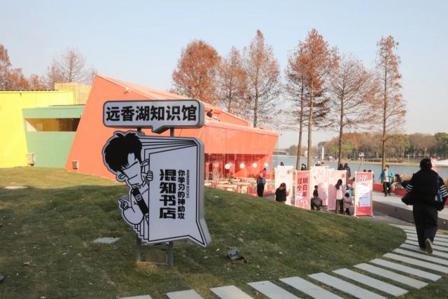 书店外观时尚美观,与远香湖的美景相得益彰。仔细一看,标志上“远香湖知识博物馆”的字样令人印象深刻,伴随着“混蛋哥”的卡通头像,展现出浓厚的文化氛围。