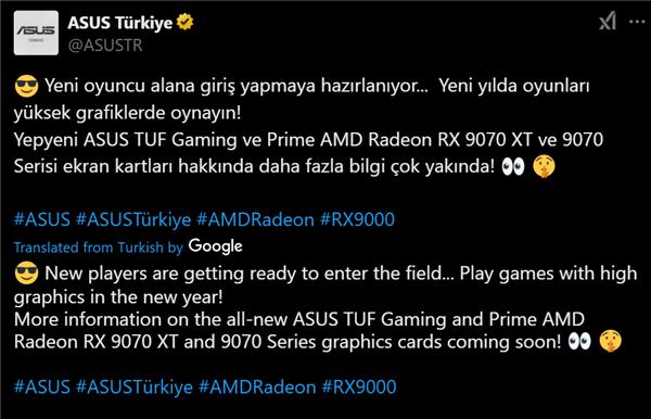 现在,华硕土耳其官推特别激动地宣布:“新玩家要进场了!新年用新卡玩游戏!RX 9070 XT、RX 9070 快到了!全新的华硕 TUF GAMING、PRIME 请期待显卡!"