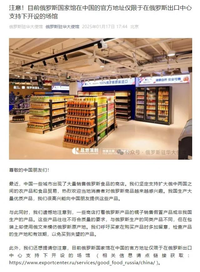 1 月 17 日本,俄罗斯驻华大使馆官方微信微信官方账号发表文章称,近日,一些中国城市出现了大量销售俄罗斯食品的商店。与此同时,我们遗憾地注意到,一些商店打着俄罗斯商品的幌子出售假货或非中国制造的产品。