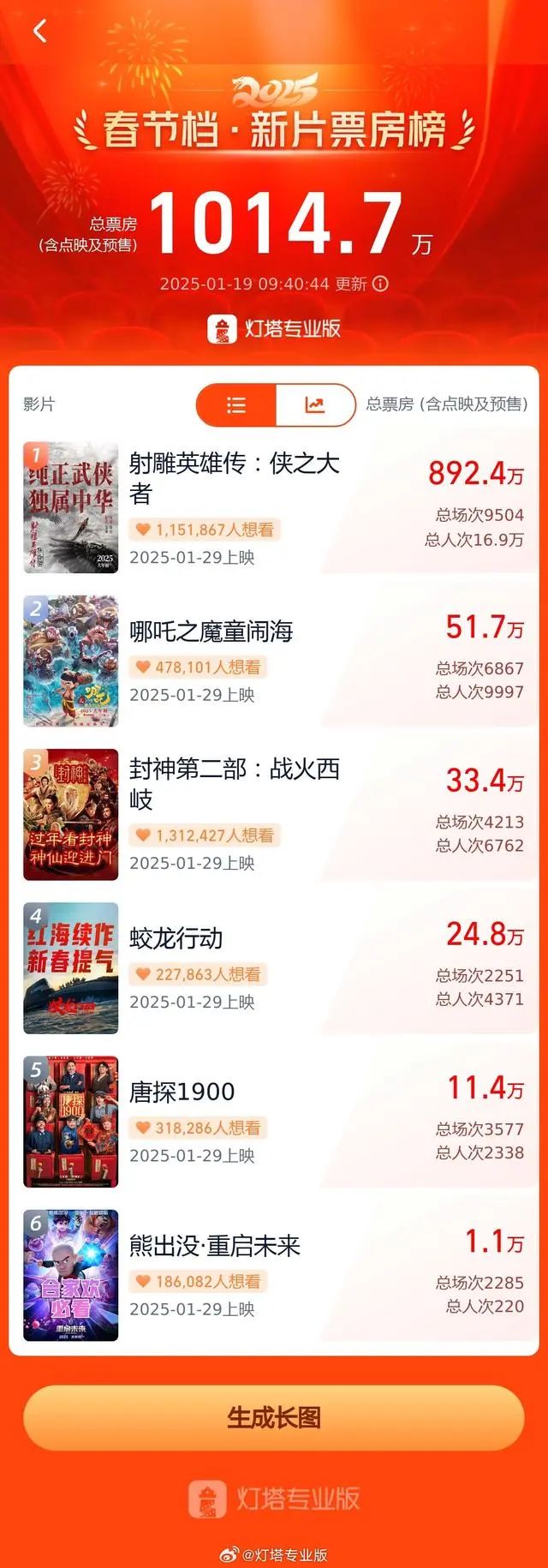 一月十九日蓝鲸新闻(记者 1月19日9时,陆鹏鹏,2025年春节档电影预购正式开播。