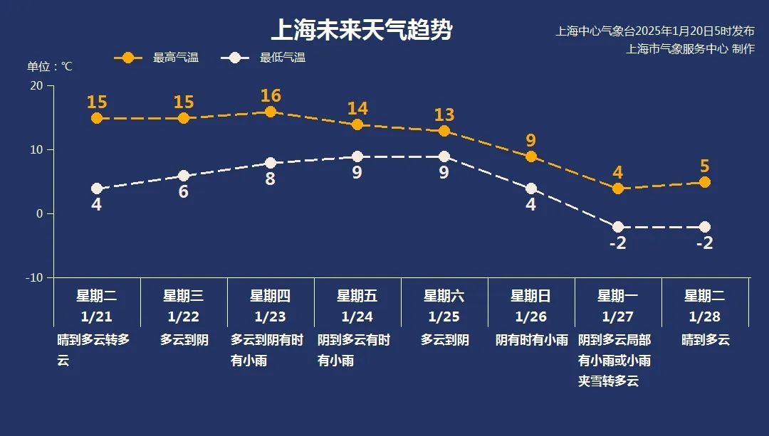 寒冷的节气通常是上海一年中最冷的时候,但是今年寒冷的开始就是温暖的天气。周四以前,申城气温持续升高,周中最高气温将升至15~16℃,最低气温也接近10℃。从星期四开始,天空云系增多,阴雨天气再次上线,届时有望减少上海一个多月的干燥天气。24日至27日,强冷空气向中国中东部地区移动,周日前后上海气温明显下降。请关注附近的天气预报信息,采取防寒措施。