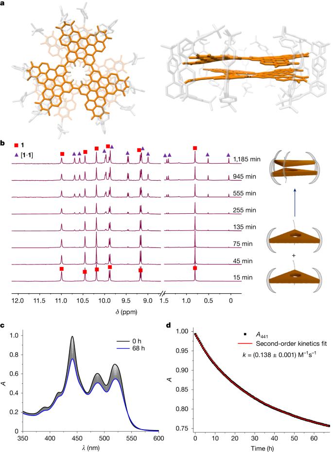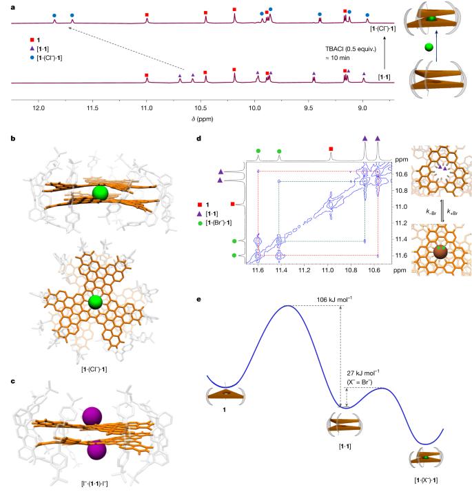 该研究合成了一种直径为1.4的原子级精确单苯孔。Å纳米石墨烯。通过形成稳定的二聚体(热学和动力学),如单个苯大小孔,然后形成卤化物捕获的双层纳米石墨烯,获得卤化物渗透的实验证据。1H NMR滴定试验、质谱和单晶X射线晶体分析揭示了三成分络离子的形成,其中两层络离子捕获了卤化物离子。由于卤化物只有两个埃大小的孔才能到达内腔,所以对三成分超分子复合物的实验观察明确证明了卤化物通过单个苯渗透的缺陷。