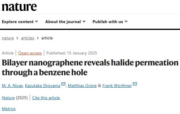 最近,德国维尔茨堡大学Frank Würthner和Kazutaka Shoyama通过分子纳米石墨烯中单个苯大小缺陷的渗透,合作报道了卤化物。利用自聚集的超分子原理,构建了两层纳米石墨烯,结构稳定。由于两层纳米石墨烯的内腔只能通过两个埃大小的窗口进入,所以任何被困在内腔内的卤化物都需要通过单个苯孔渗入。实验表明,氯化物、氟化物和溴化物通过单个苯孔具有透水性,而碘化物不能渗透。另外,氟化物在单层纳米石墨烯上表现出较高的透水性,并且可以在两层纳米石墨烯中完成卤化物的选择。这些发现为开发人工卤化物受体、制造过滤膜以及利用石墨烯中的单苯缺陷进一步构建多层人工氟化物通道提供了希望。有关研究工作以“Bilayer nanographene reveals halide permeation through a benzene hole“问题发表在国际顶级期刊上。《Nature》上。