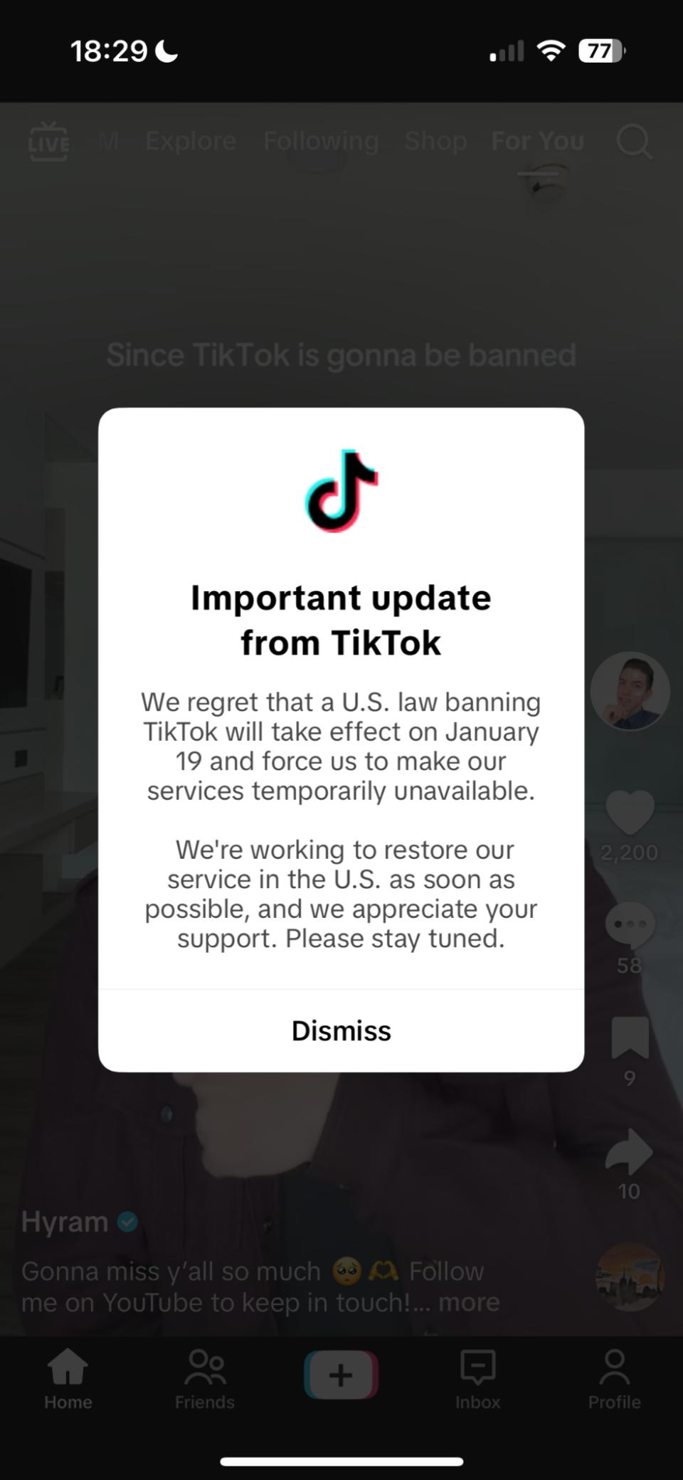 这条弹出消息发布后不久,许多美国用户发现,当TikTok应用再次打开时,该应用程序已经处于不可用状态。客户收到一条新的弹出消息,报道称“对不起,TikTok现在不能使用了。很遗憾,一项法律禁止TikTok在美国服务,这意味着你现在不能使用TikTok。”