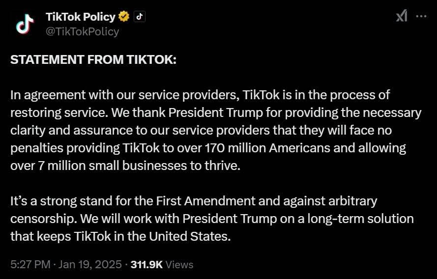 同时,TikTok还通过官方X账号发表声明称,“根据与我们的服务供应商达成的协议,TikTok 服务正在恢复过程中。我要感谢美国候任总统特朗普为我们的服务提供商提供必要的澄清和保证,以确保他们正在超越。 1.7 亿美国客户提供 TikTok 超越服务和协助 700 当万小企业蓬勃发展时,不会受到任何惩罚。我们将与特朗普合作,寻找长期的解决方案,以确保 TikTok 可以继续在美国运作。”
