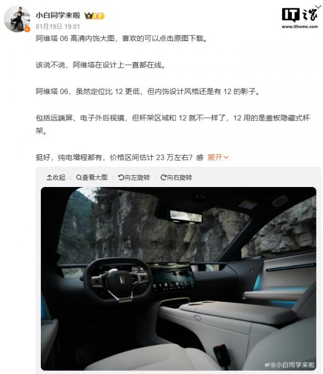 IT 世家 1 月 20 每日消息,继内饰设计稿发布后,一组阿维塔 06 昨天在社交平台上曝光了实车内饰谍照,展示了这款车的大概座舱设计。