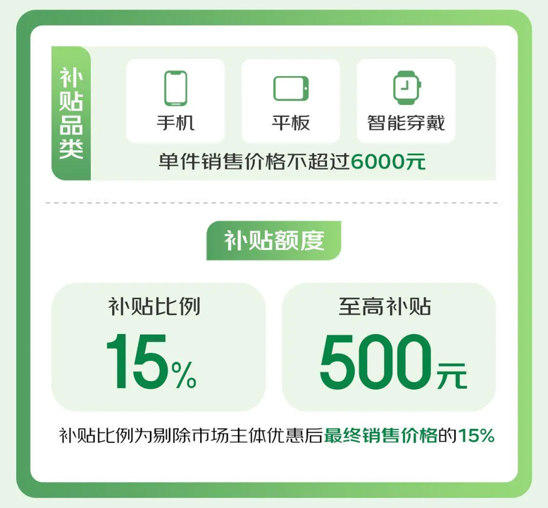 消费者可以通过在JD.COMAPP搜索“3C国家补贴”进入活动会场,购买手机、平板电脑、智能手表(手环)三类数码产品(单件销售价格不超过6000元),按商品销售价格的15%享受补贴。每个客户每个产品可以享受一个补贴,每个补贴不超过500元。三类产品每人最高可节省1500元。