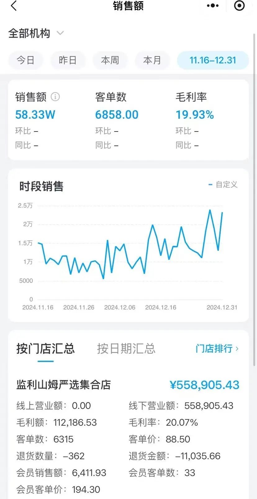 但是监利有“山姆”,监利的“山姆”也卖得很好。到2024年11月16日,监利“山姆”正式开业,截至2024年12月31日,其销售额超过58万元,客奇数为6858单,平均毛利率接近20%。