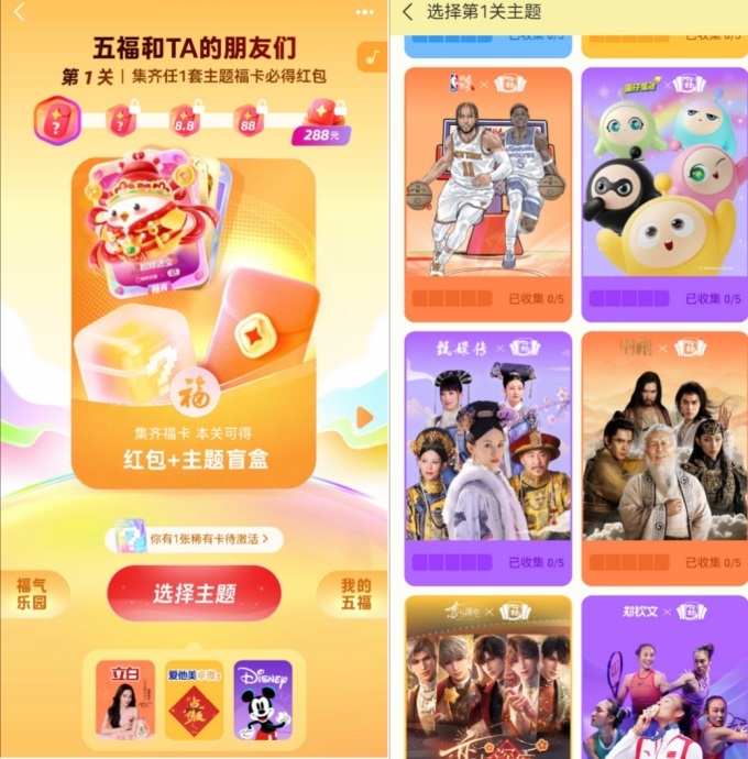 登录支付宝搜索“集福”,进入集福会场,随机获得3张福卡。与以往的模式不同,集福今年设置了5个层次,每个层次对应一套福卡。点击「选择主题」之后你会发现有28套IP主题福卡可供选择,涵盖泡泡玛特、甄嬛传、封神二、漫威漫画等知名IP。收集一套福卡,立即抽奖。除了红包,还有IP主题盲盒,权益增加。