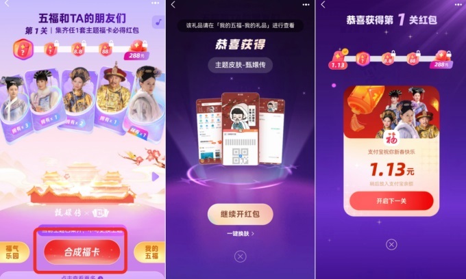今年的卡片收集也是多种多样的。除了经典的扫描“福”字的卡片,还可以扫描所选IP主题的相关元素的卡片。以“甄嬛传”福卡为例,点击“扫描”选择“探索五福”。扫描甄嬛、皇后等人后,甄嬛传系列中出现了几张不同的福卡。同时,你也可以通过看视频和触摸支付来获得卡片。