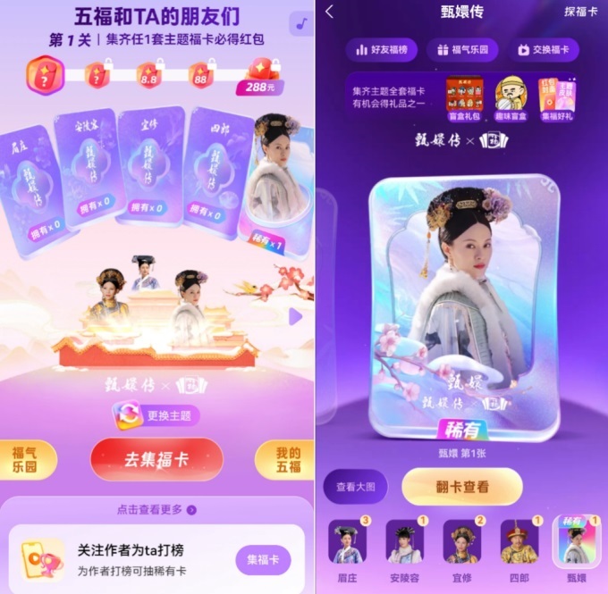福卡中的“稀有卡”也是一个亮点。它的概念类似于传统五福中的“奉献之福”。因为它经常成为网友难以聚集的卡片,所以它的“稀缺”特征被保存下来。在这次聚福的每一个IP主题的五张卡中,都有一张卡变成了“稀有卡”。比如《甄嬛传》主题的稀有卡就是《甄嬛》。