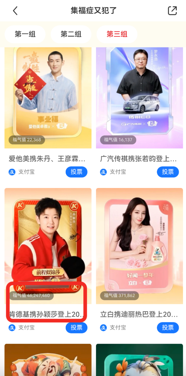 今年,福卡成为集福最大的亮点。1月15日,支付宝发布新28套主题福卡后,引发客户广泛讨论。 ,在小红书上,射雕福卡迅速登上微博热搜,Loopy、封神等IP粉丝开始组队集卡,KFC联合孙颖莎主题福卡,人气第一,吸引了43多人参加投票。