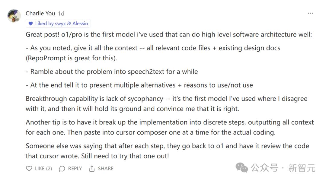 最新评论:o1/pro是我用过的第一个能很好地完成高级软件架构的模型!