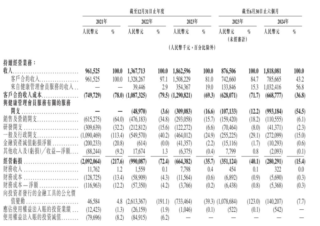 从2021年到2023年,微医持续经营业务收入分别为9.62亿元、13.68亿元和18.63亿元,比去年同期增长了42.2%和36.2%。2024年上半年,微医控股持续经营业务收入从2023年同期的8.77亿元增长到18.18亿元,增长了107%。