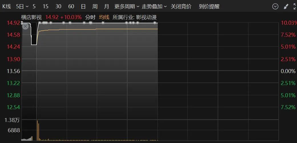 早上影视院线概念全线高开高走,板块指数一度大幅上涨4%以上,半天交易超前一个交易日全天交易。横店影视高开后,仅1分钟左右就有强势涨停,金逸影视也直线封板,幸福蓝海、博纳影业等涨幅居前。