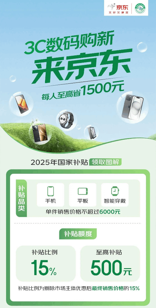 如果你想足不出门,可以享受国家补贴,更换新机器,在JD.COMAPP搜索“3C国家补贴”进入活动会场,购买手机、平板电脑、智能手表(手环)三类数码产品(单件销售价格不超过6000元),按商品销售价格的15%享受补贴,每个客户每个产品可以享受一个补贴,每个补贴不超过500元。