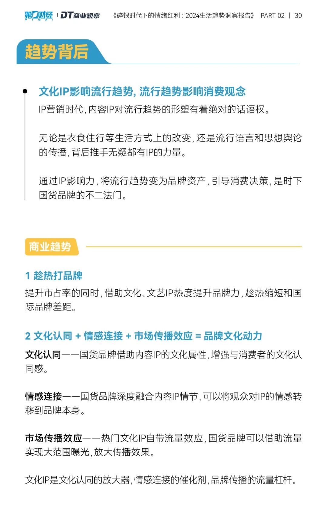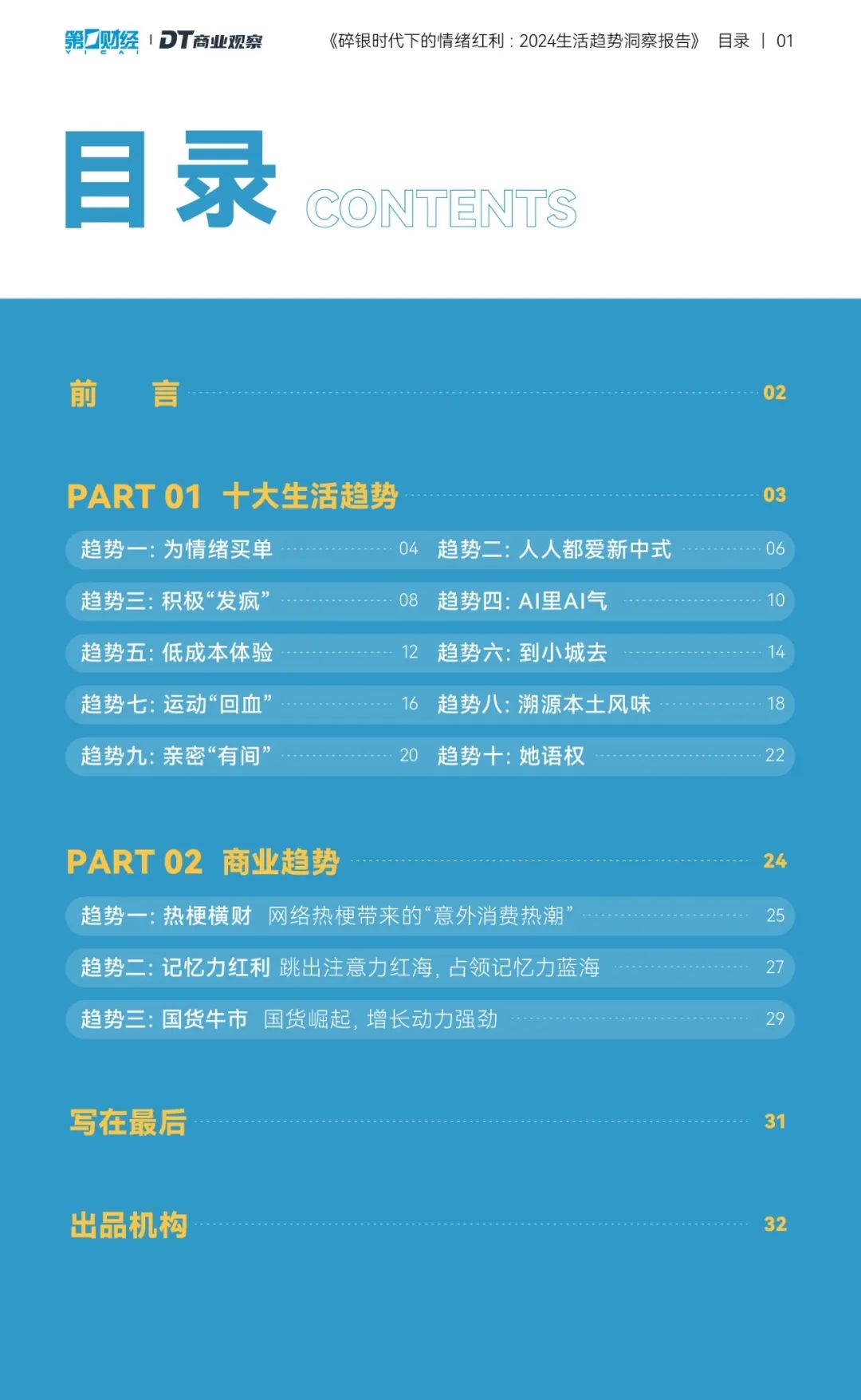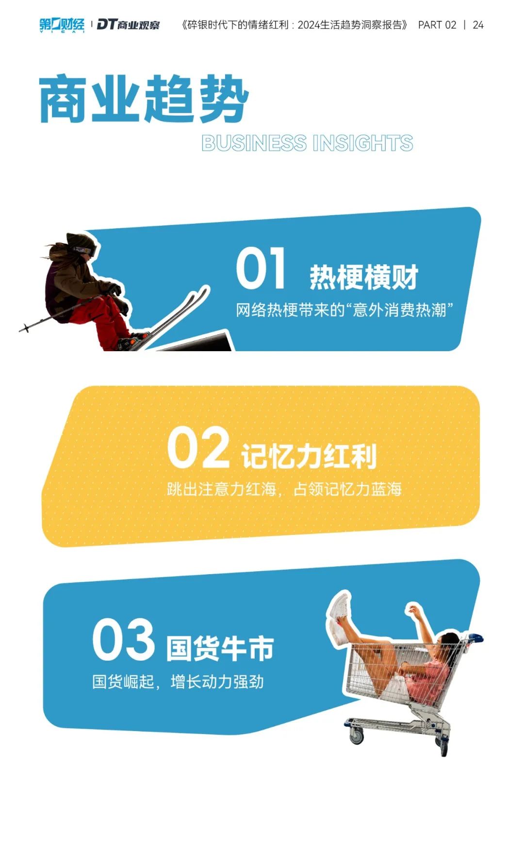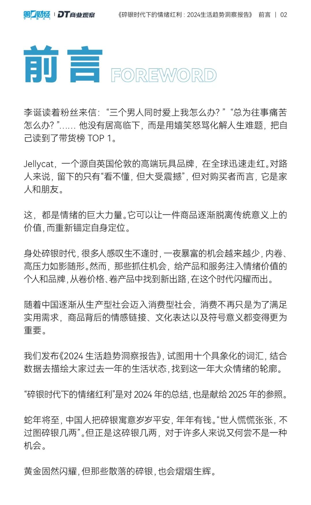 基于过去一年DT团队对社会流行和年轻人洞察的持续观察和研究,我们发布了这份《碎银时代情感红利:2024年生活趋势洞察报告》。报告依托大数据分析,验证和总结了当代年轻人的生活状况和趋势,以及延伸的商业洞察力。