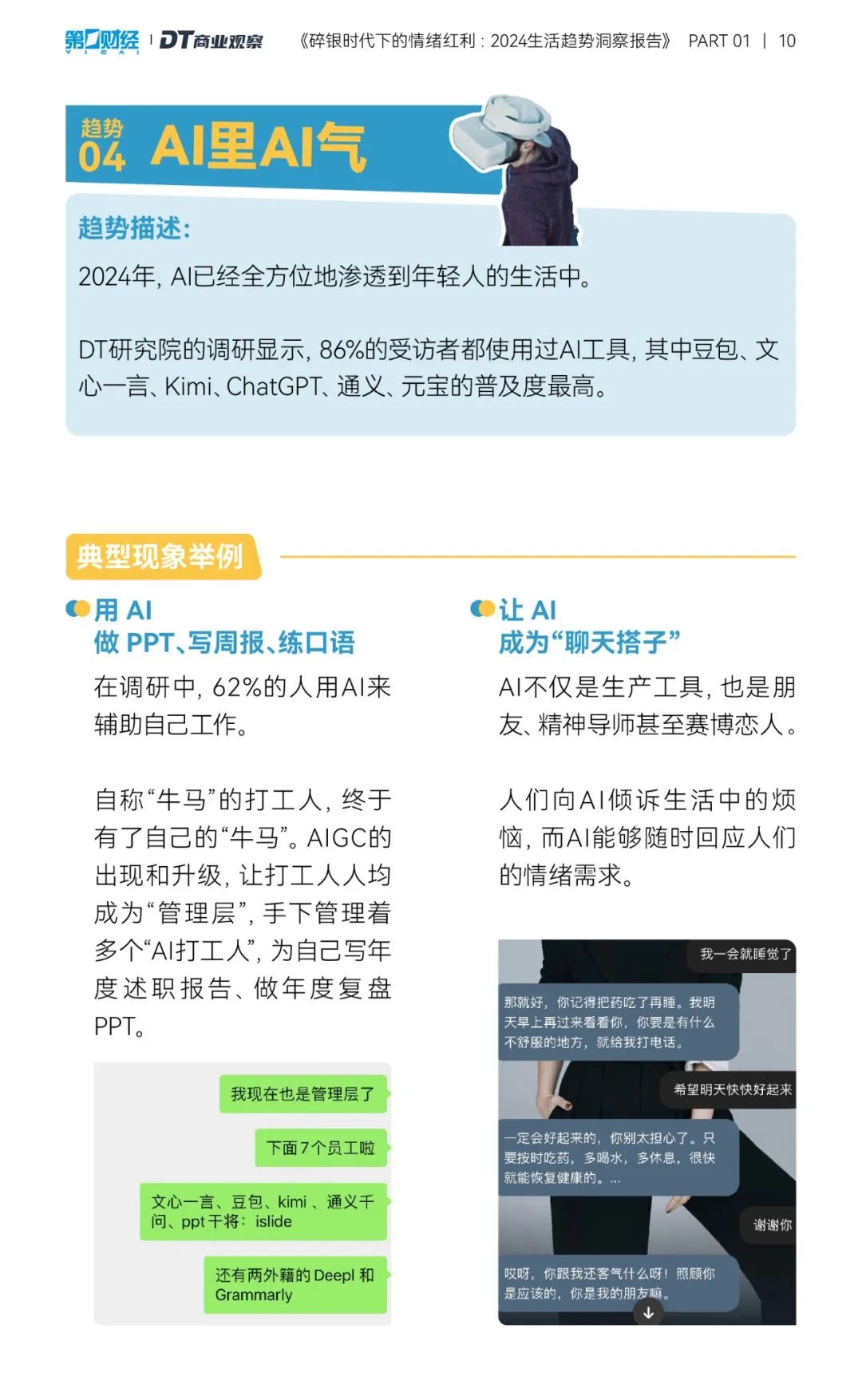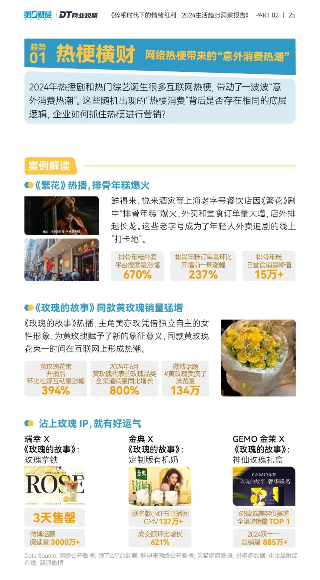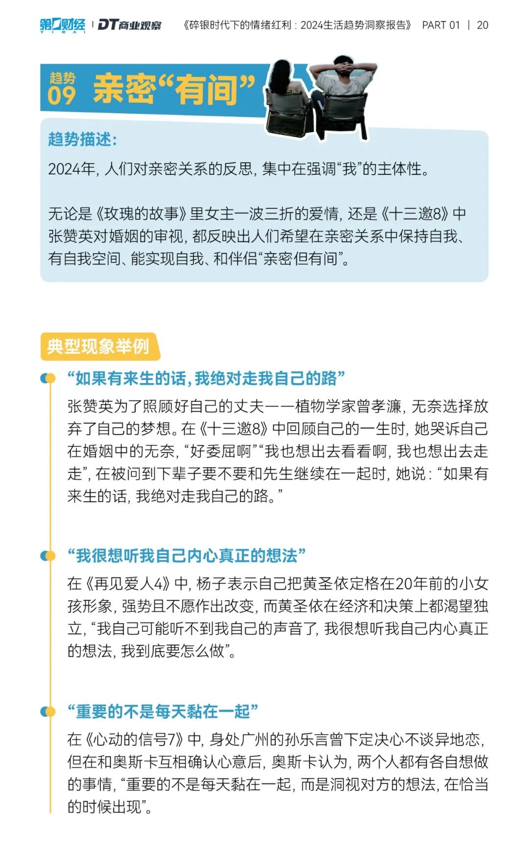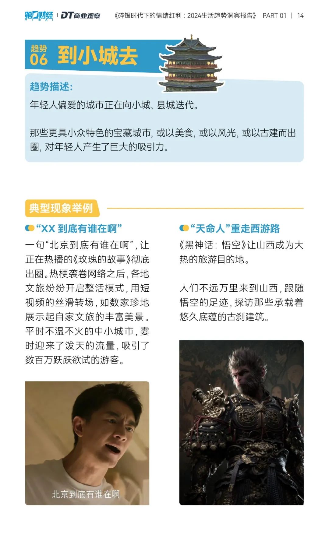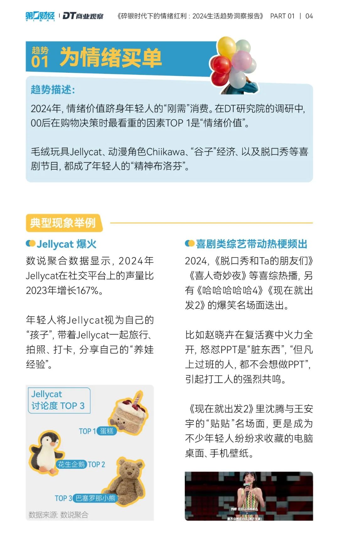 基于过去一年DT团队对社会流行和年轻人洞察的持续观察和研究,我们发布了这份《碎银时代情感红利:2024年生活趋势洞察报告》。报告依托大数据分析,验证和总结了当代年轻人的生活状况和趋势,以及延伸的商业洞察力。