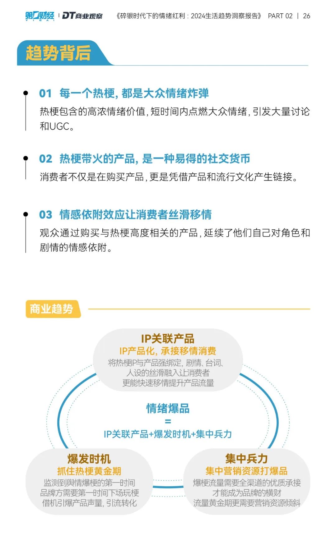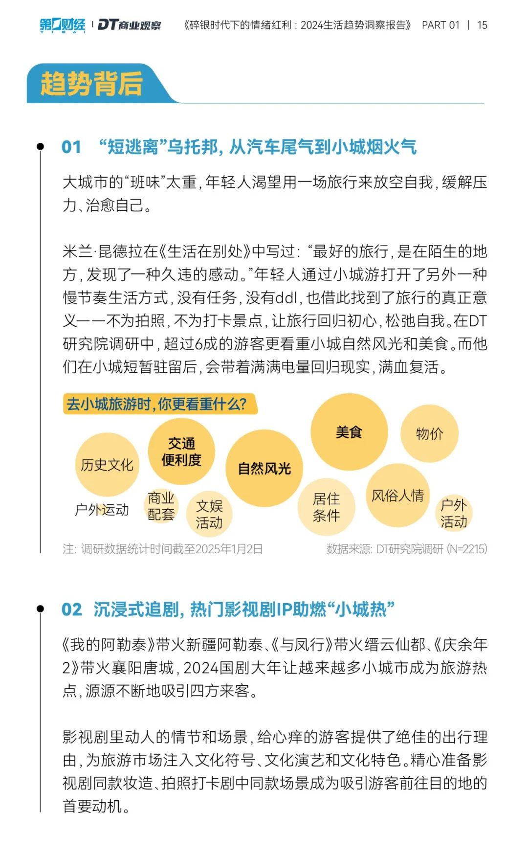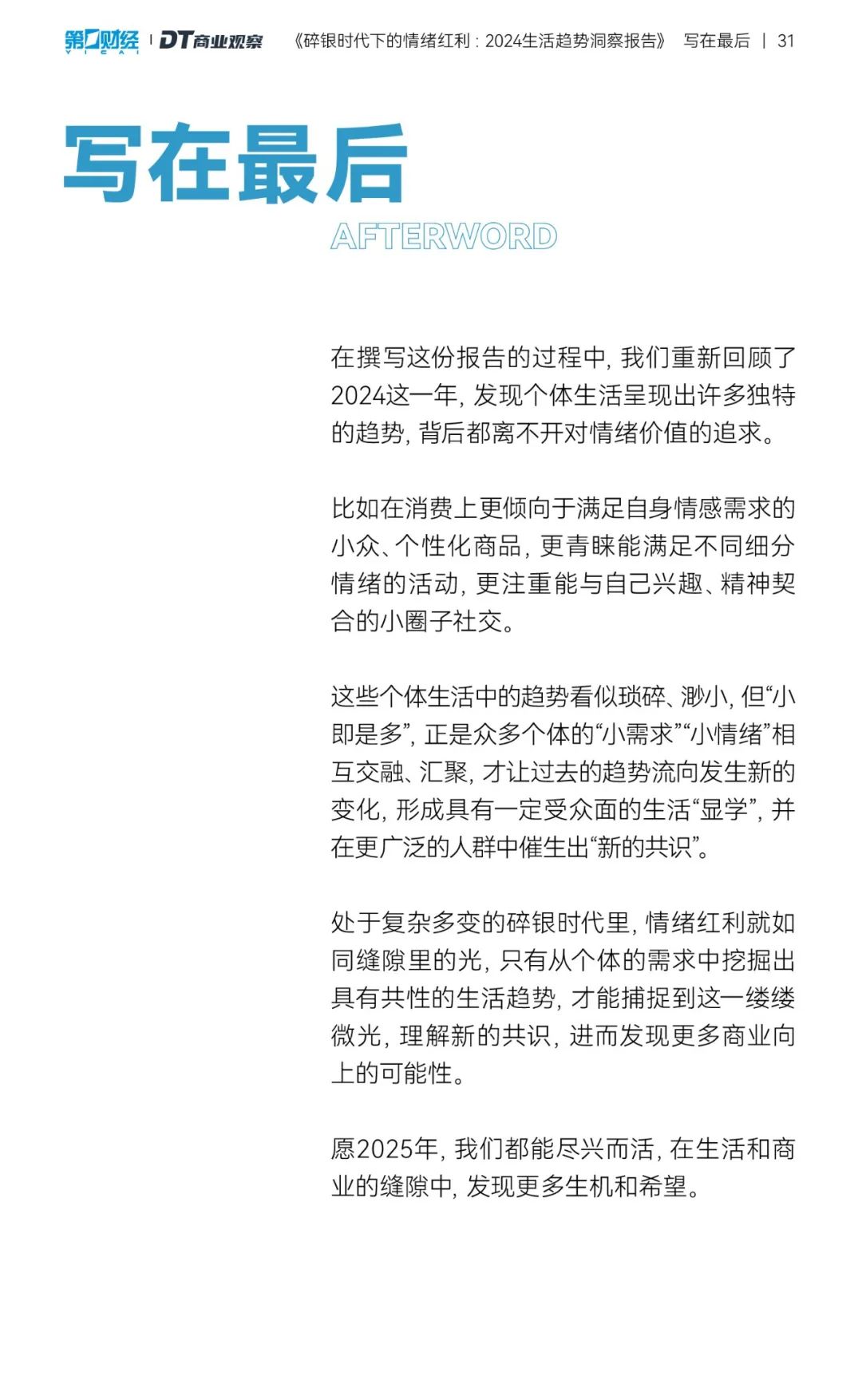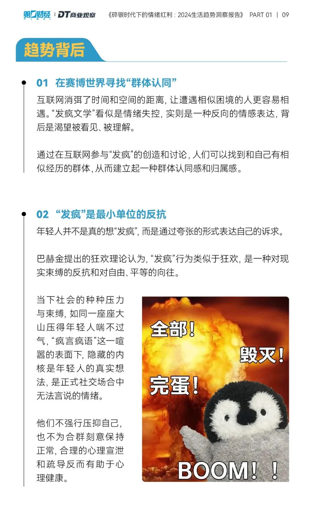 基于过去一年DT团队对社会流行和年轻人洞察的持续观察和研究,我们发布了这份《碎银时代情感红利:2024年生活趋势洞察报告》。报告依托大数据分析,验证和总结了当代年轻人的生活状况和趋势,以及延伸的商业洞察力。
