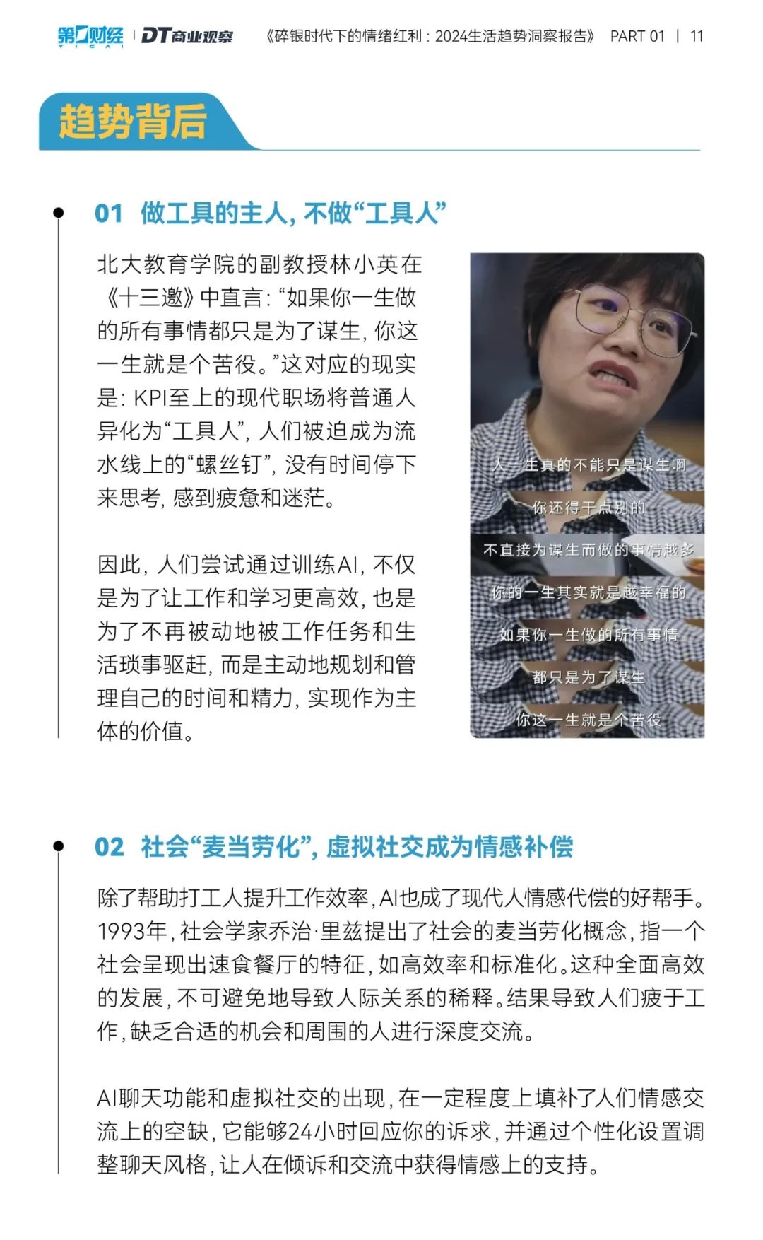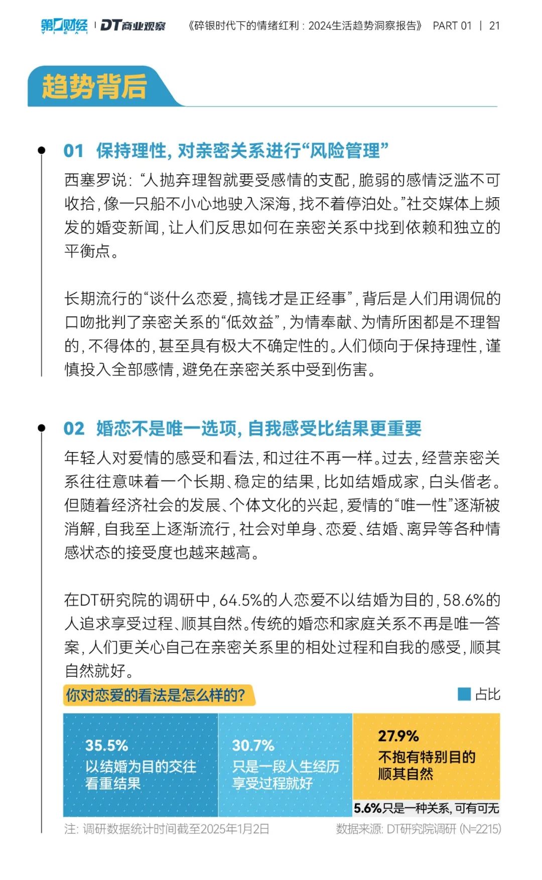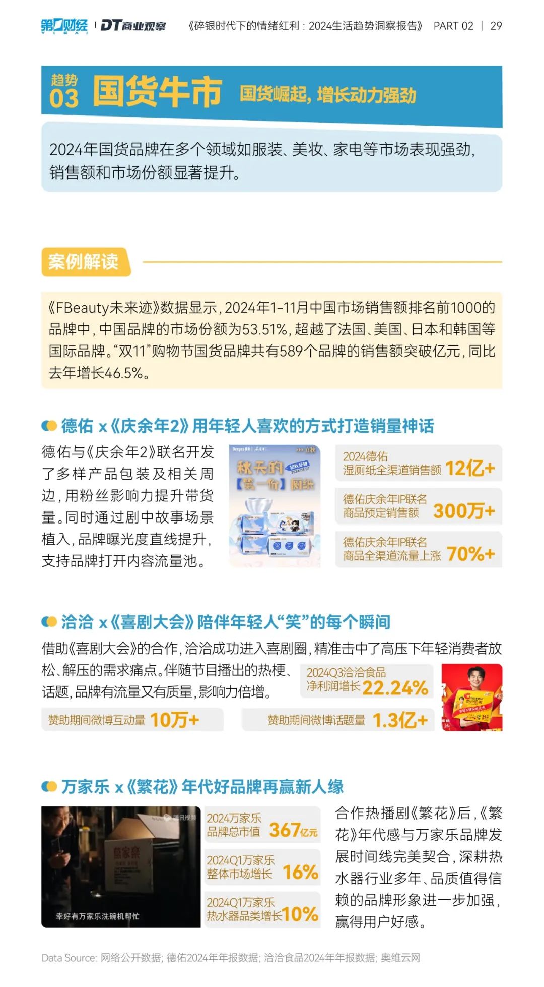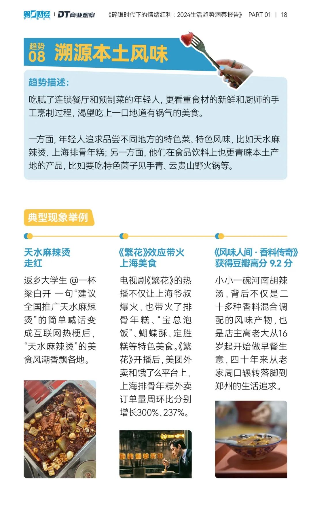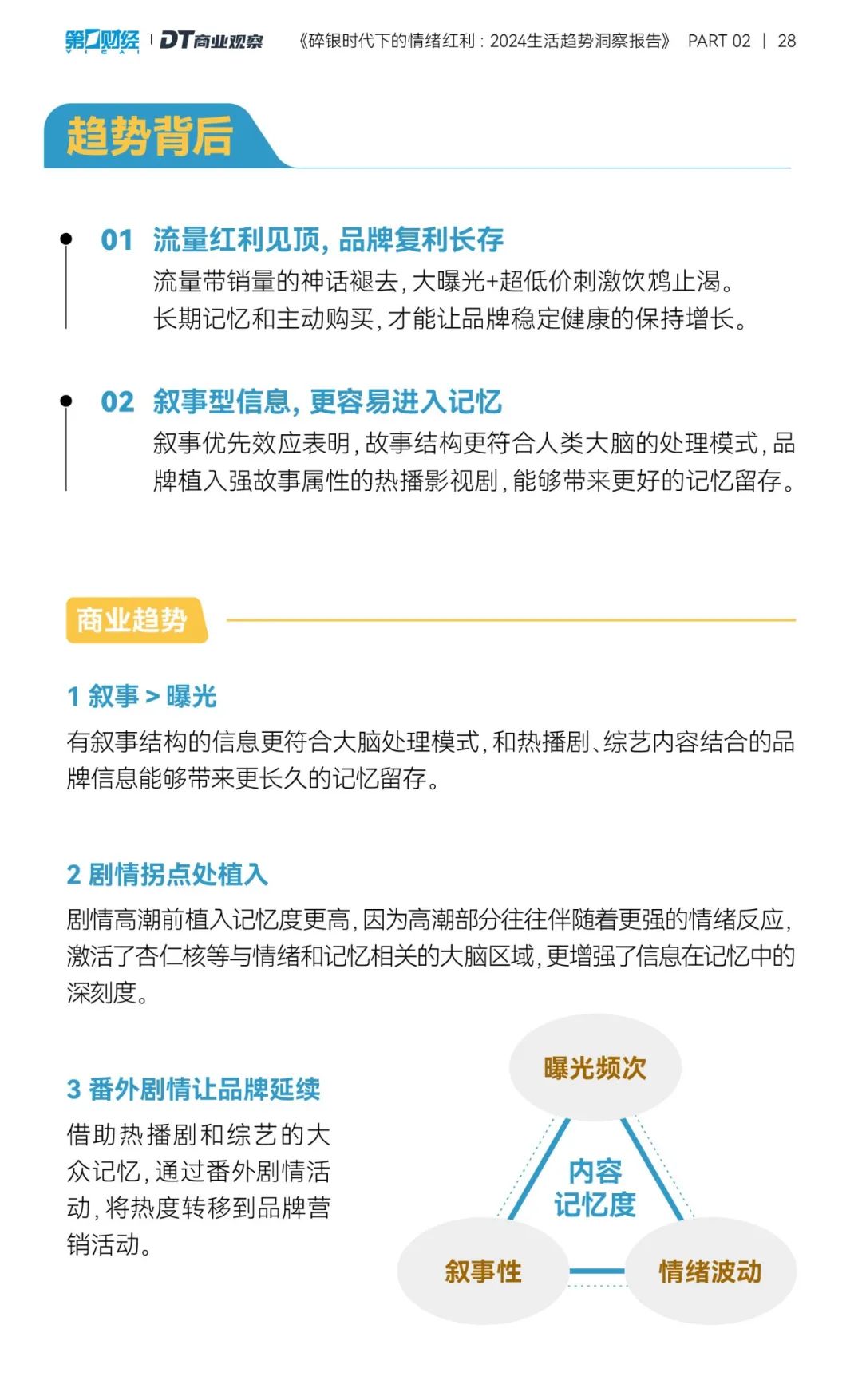 基于过去一年DT团队对社会流行和年轻人洞察的持续观察和研究,我们发布了这份《碎银时代情感红利:2024年生活趋势洞察报告》。报告依托大数据分析,验证和总结了当代年轻人的生活状况和趋势,以及延伸的商业洞察力。