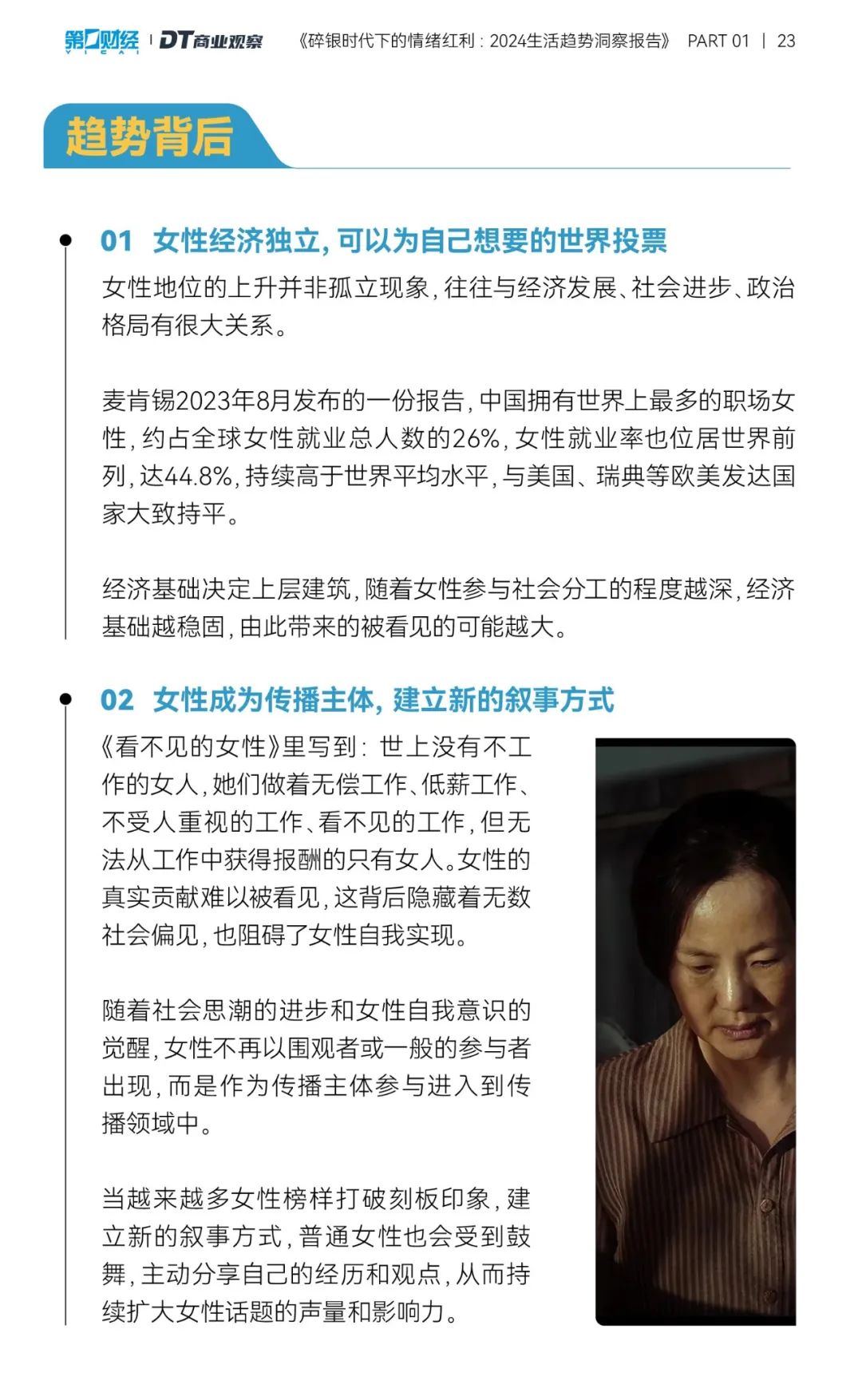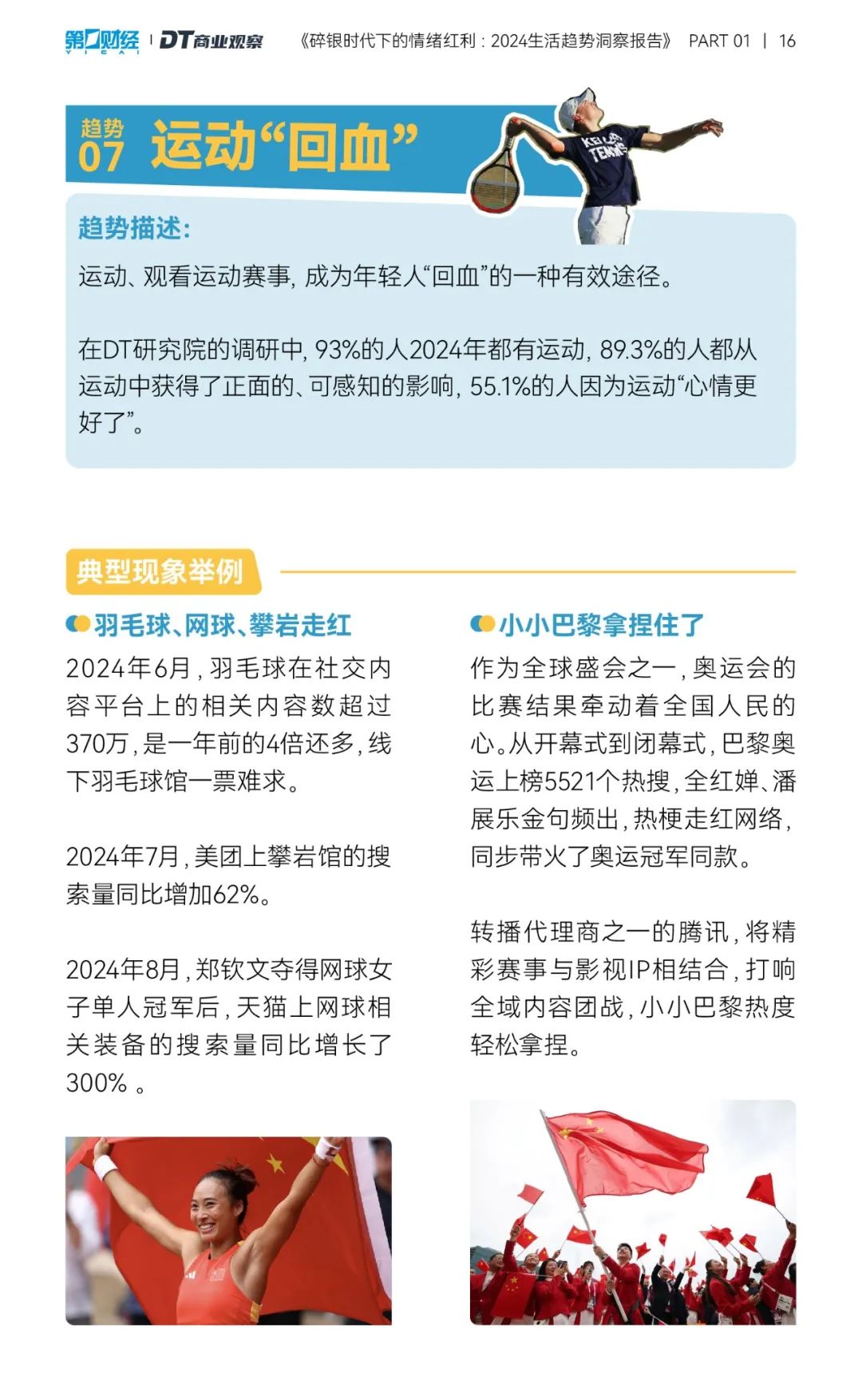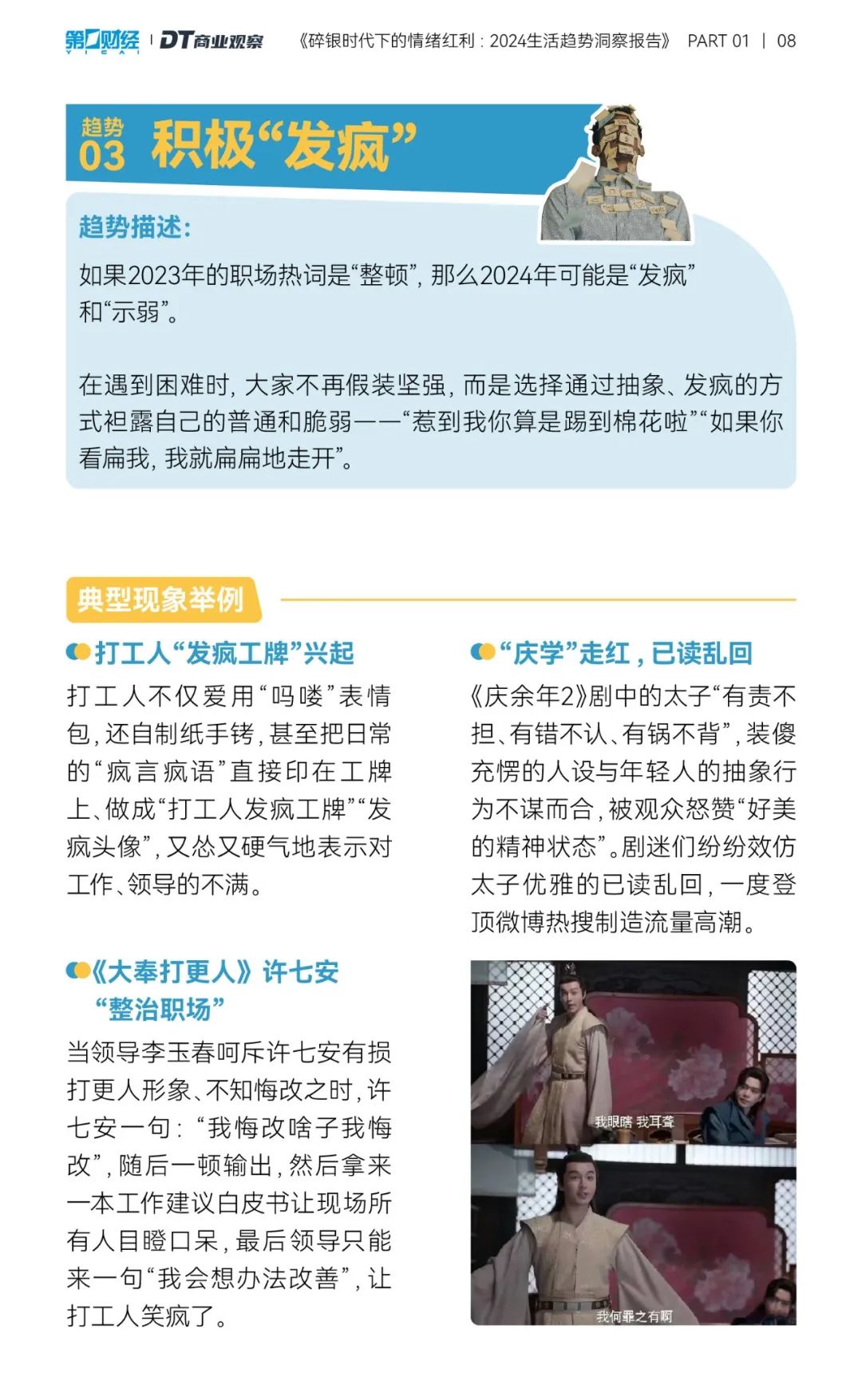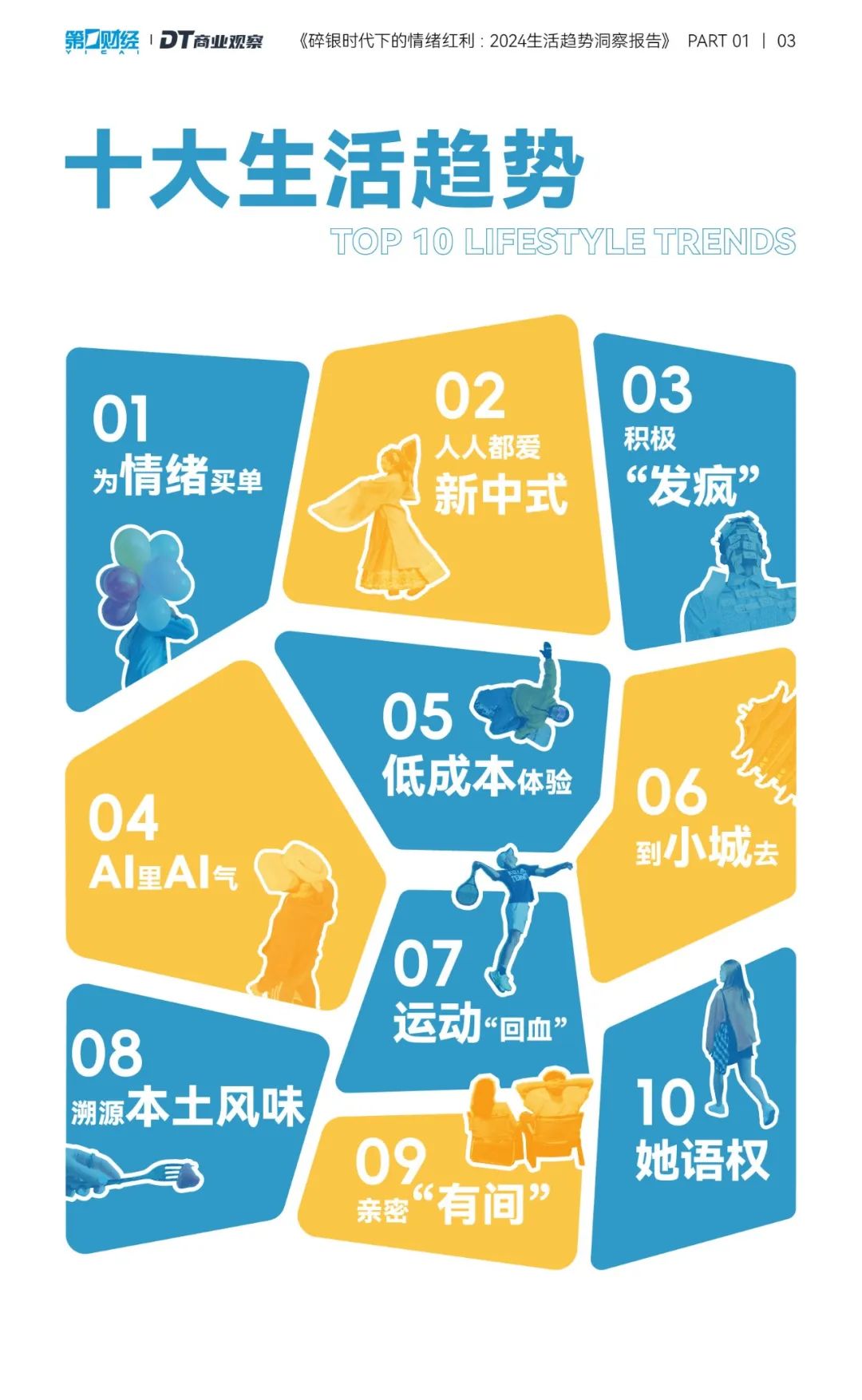 本文来自微信微信官方账号的“DT商业观察”。作者:DT商业观察,36Kr授权发布。(原标题:“积极“疯狂”、女性被看见 、锻炼“加血”| 十大生活趋势2024)
