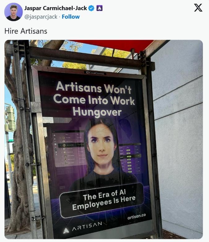 早些时候,来自旧金山的科技公司Artisan在街上发布了一系列“停止雇佣人类”的广告。