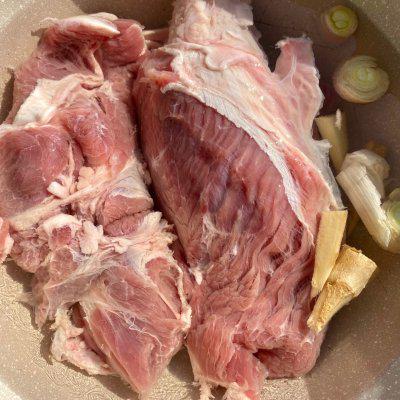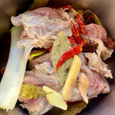 1、准备新鲜牛筋浸泡成血液,冷水下锅,加入葱姜料酒焯水除腥。