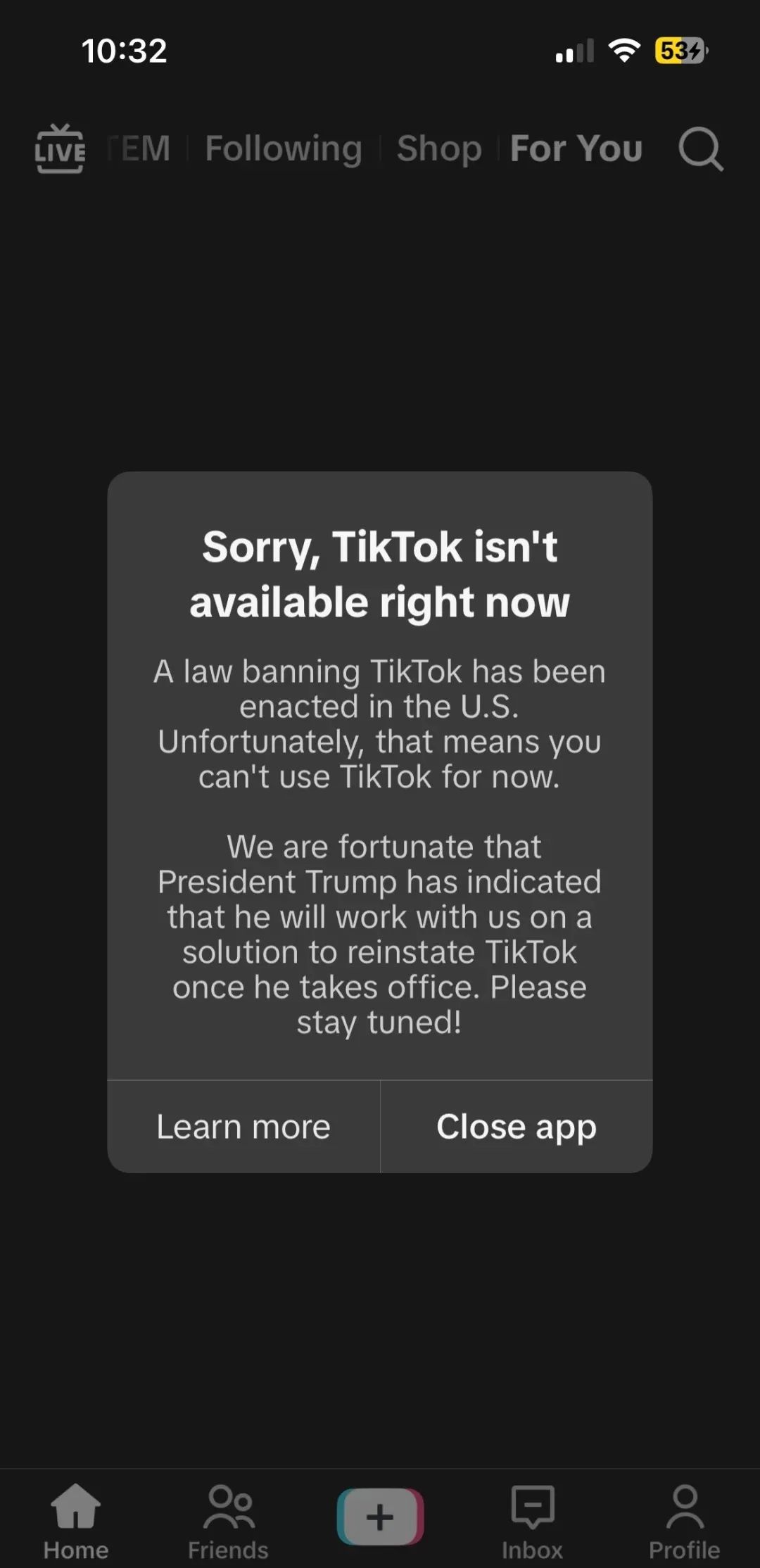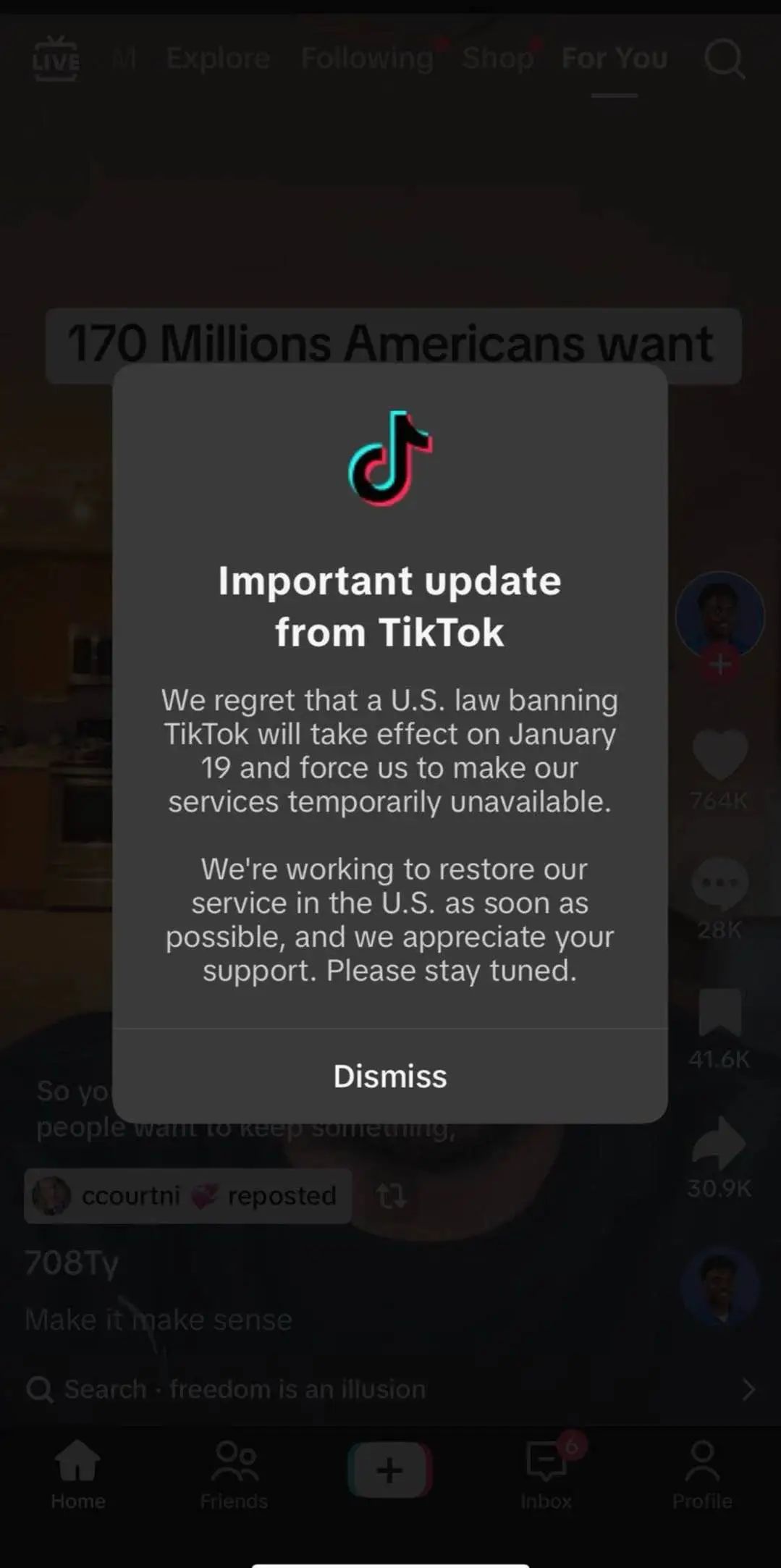 遗憾的是,我们有一个禁令。 TikTok 美国的法律将会存在 1 月 19 每天都有效,迫使我们暂时停止提供服务。