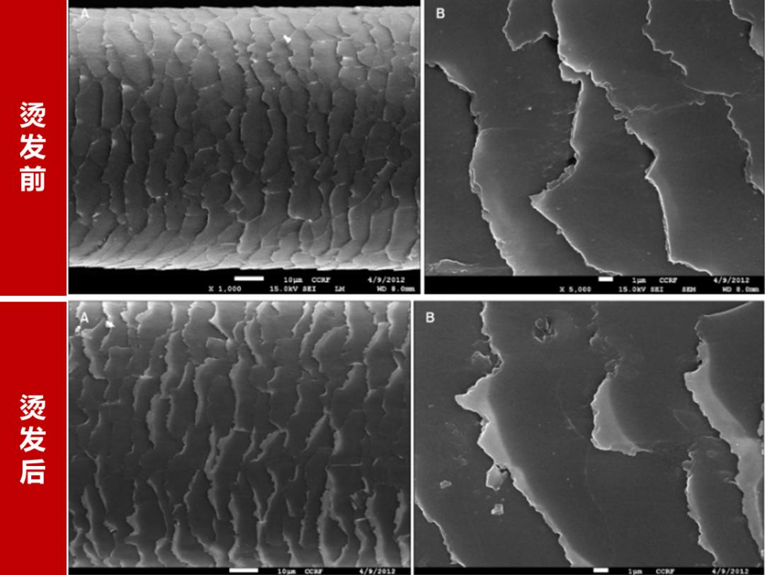 当然可以,下面这张图,就显示了烫发前后头发表皮的变化。