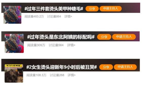最近几天,#过年三件套烫发美甲种睫毛#、#过年烫头是东北阿姨的必备吗?#、#2女孩烫头迎新年9小时后被丑哭#等多个烫头相关话题登上微博热搜,引发网友广泛热议。